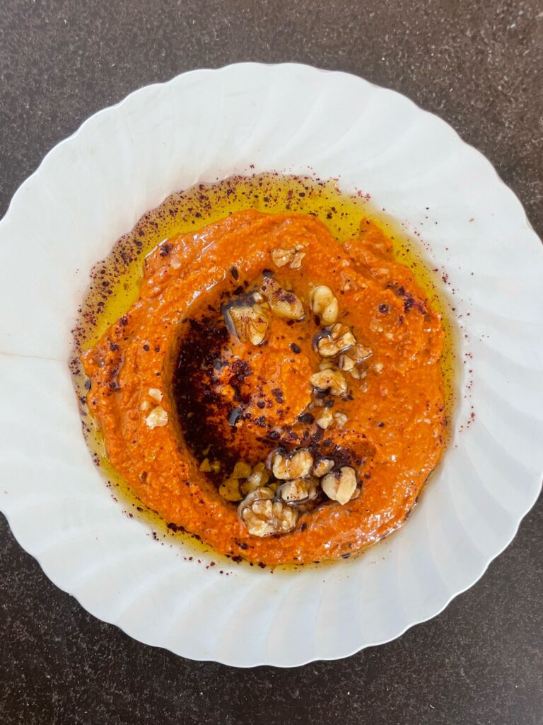 Roasted red pepper and walnut dip with pomegranate molasses.